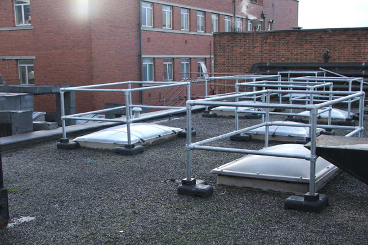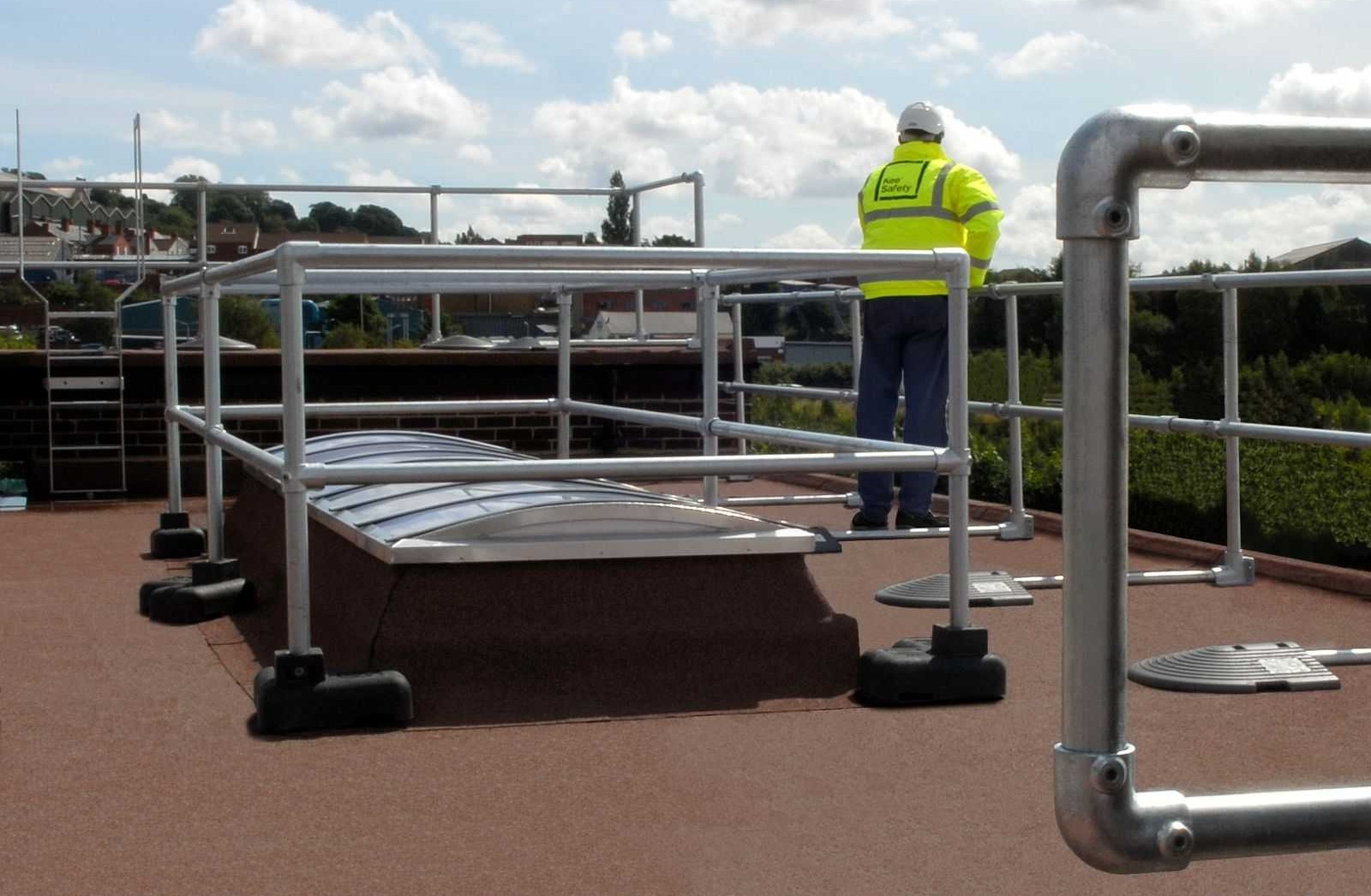 Kee Dome creates a barrier around the skylight to prevent workers from contacting the skylight. This system protects the skylight with a non-penetrating railing without damaging or puncturing the roof.