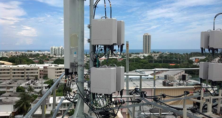 Als Sonderlösung zur Absicherung der Mobilfunkantennen wurde auch in Miami Beach die freistehende Absturzsicherung Kee Guard® auf einem Penthouse installiert. Die flexible Umwehrung für die Mobilfunkanlagen wurde der begrenzten Fläche auf dem Dach angepasst und sicher um die Hindernisse herum installiert. Die Gegengewichtsausleger der freistehenden Absturzsicherung wurden direkt unter den Mobilfunk-Masten mit 26-7er Kreuzverbindern miteinander verbunden. Mit dieser Lösung bieten die Gewichte nicht nur zusätzlichen Halt, sondern sind auch platzsparender.