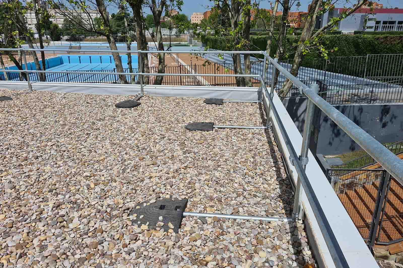 A free standing collective fall protection system that does not penetrate the roof membrane.