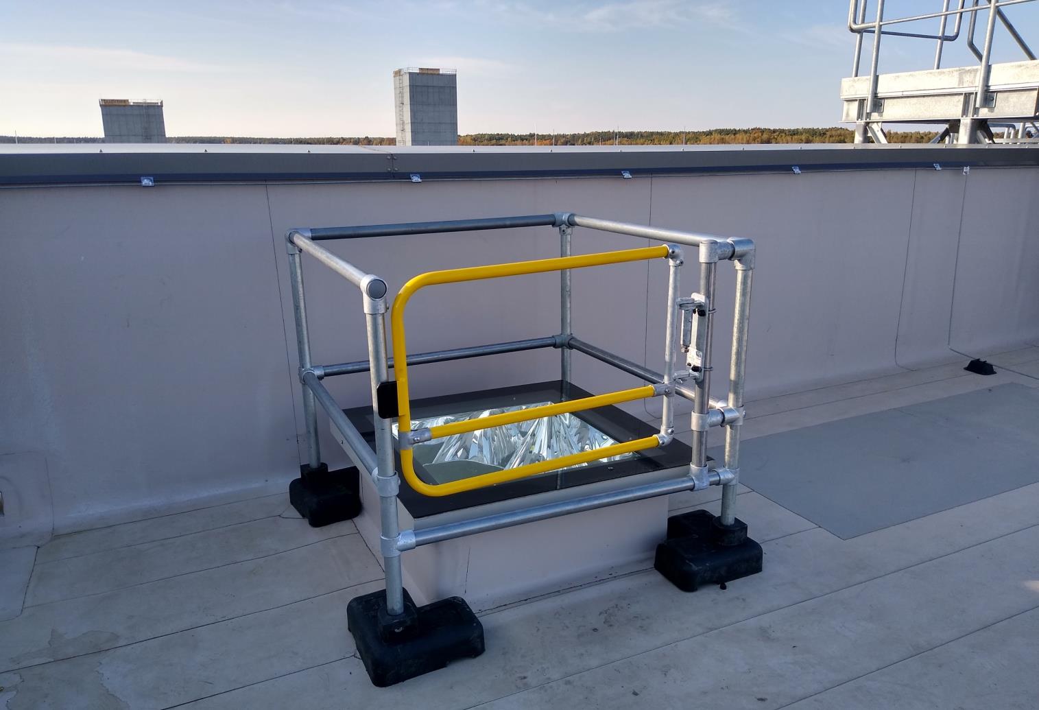 Kee Dome creates a barrier around the skylight to prevent workers from contacting the skylight. This system protects the skylight with a non-penetrating railing without damaging or puncturing the roof.