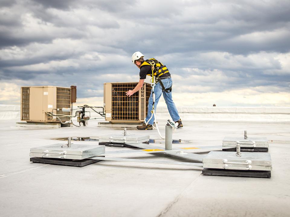 Rubber-coated base weights are supplied with suction cups which applies additional friction to the roof membrane, further reducing any movement during a fall arrest event. There are also over 100 suction cups moulded to each rubber bonded weight to maximize grip.